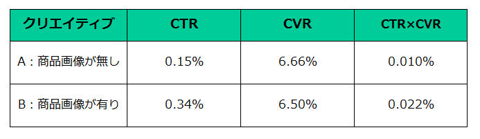 コンバージョン率(CVR)はほぼ同じだったものの、一定のインプレッション(imp)に対してCVが獲得できる割合(=右列のCTR×CVR)が向上しました。