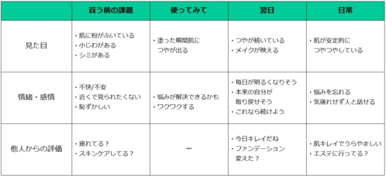 このフレームワークと同時に、商品を実際に使用するなどして、商品が届く前の気持ちや使用体験、効果の実感など、いわゆるカスタマージャーニーも形作っていきます。