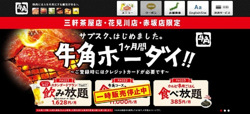 月額11,000円で、通常3480円の「牛角コース」が食べ放題になるという、お得感のある価格が、人気を博していました。